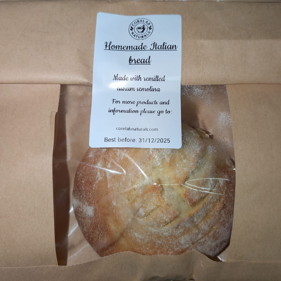 Our homemade Italian bread is crafted using re-milled semolina, a traditional flour prized for its depth of flavour, gentle texture, and natural character. We intentionally use flour that is unbleached, free from added vitamins, and contains no preservatives, allowing the bread to remain as close to its natural state as possible.
